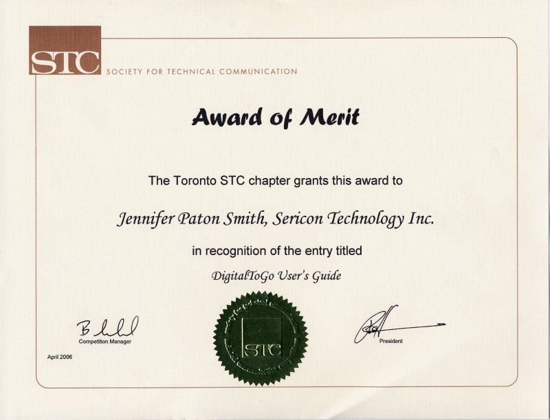 - 2006 – STC (Society for Technical Communication) Toronto chapter presented the Award of Merit to me for the DigitalToGo User’s Guide, which I created for Sericon Technology.