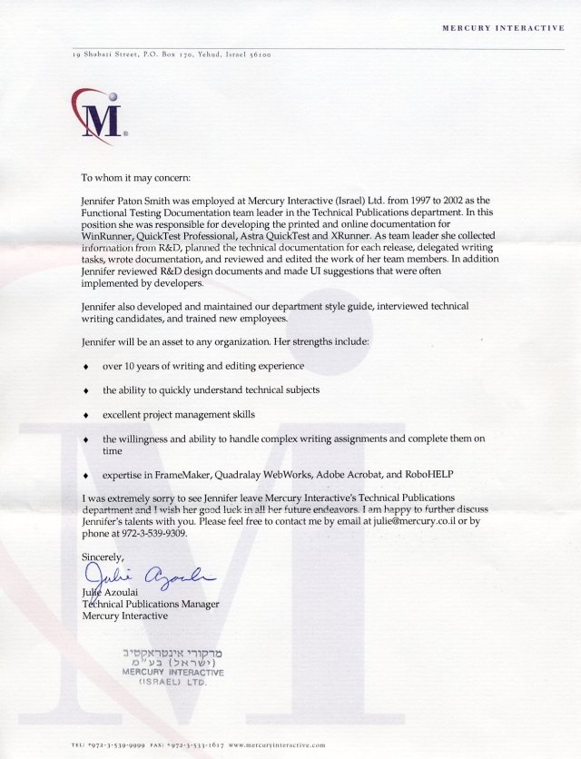 Julie Azoulai, Technical Publications Manager at Mercury Interactive, and Jennifer’s manager from 1997-2002.